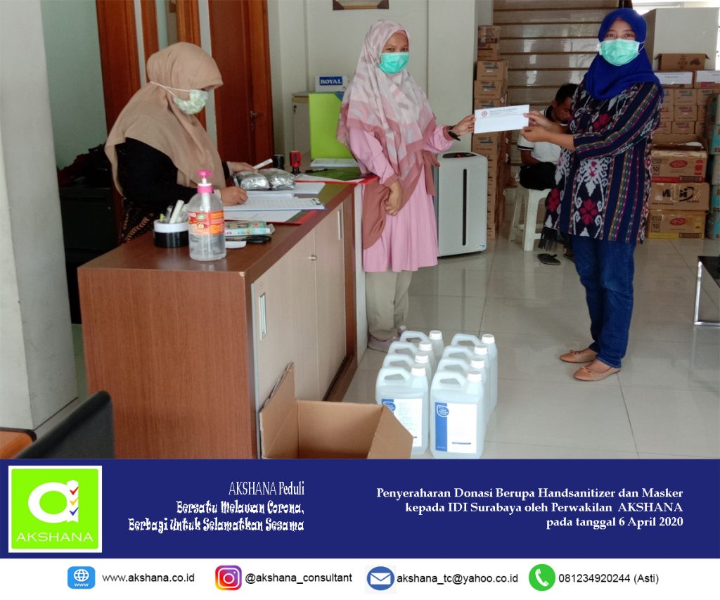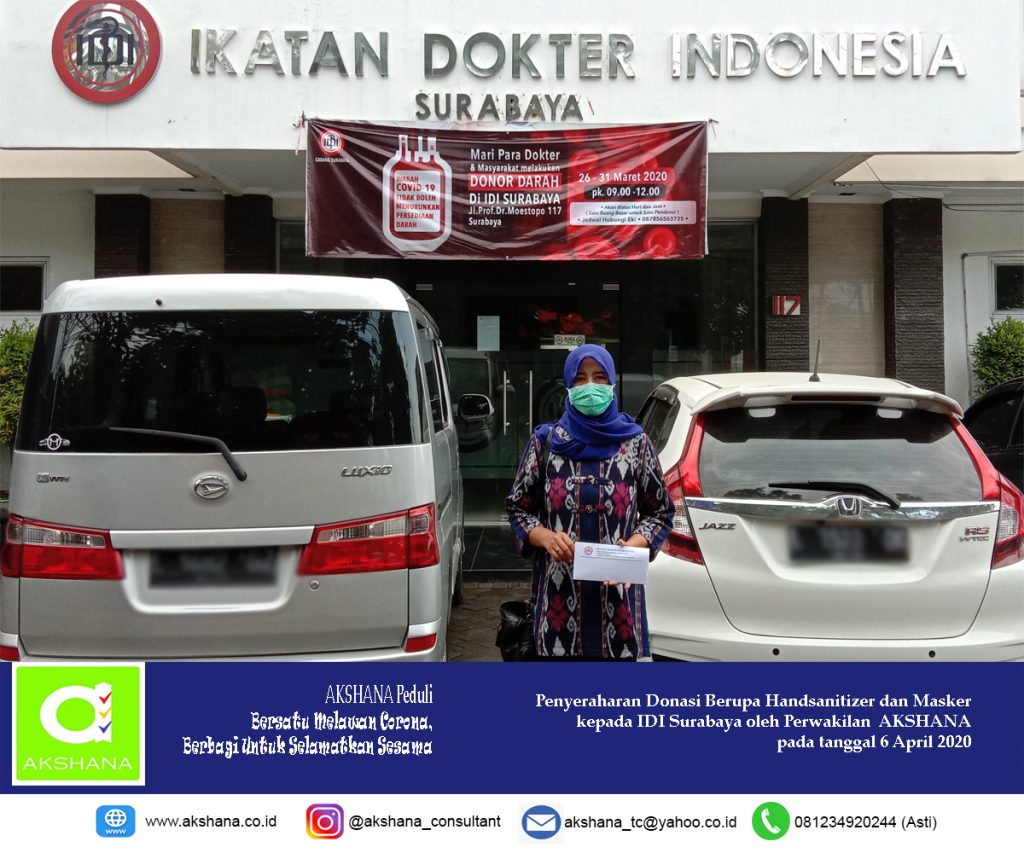 Lembaga Pelatihan dan Konsultasi Akshana ikut peduli dalam mencegah penyebaran Covid-19. Melalui kegiatan Akshana Peduli, perwakilan dari Lembaga Pelatihan dan Konsultasi Akshana telah menyerahkan donasi berupa handsanitizer dan masker, untuk diserahkan kepada para dokter dan perawat Rumah Sakit yang membutuhkan. Penyerahan dilakukan di kantor IDI Surabaya Jl. Mayjen Prof. Dr. Moestopo No.117, Surabaya pada tanggal 6 April 2020.