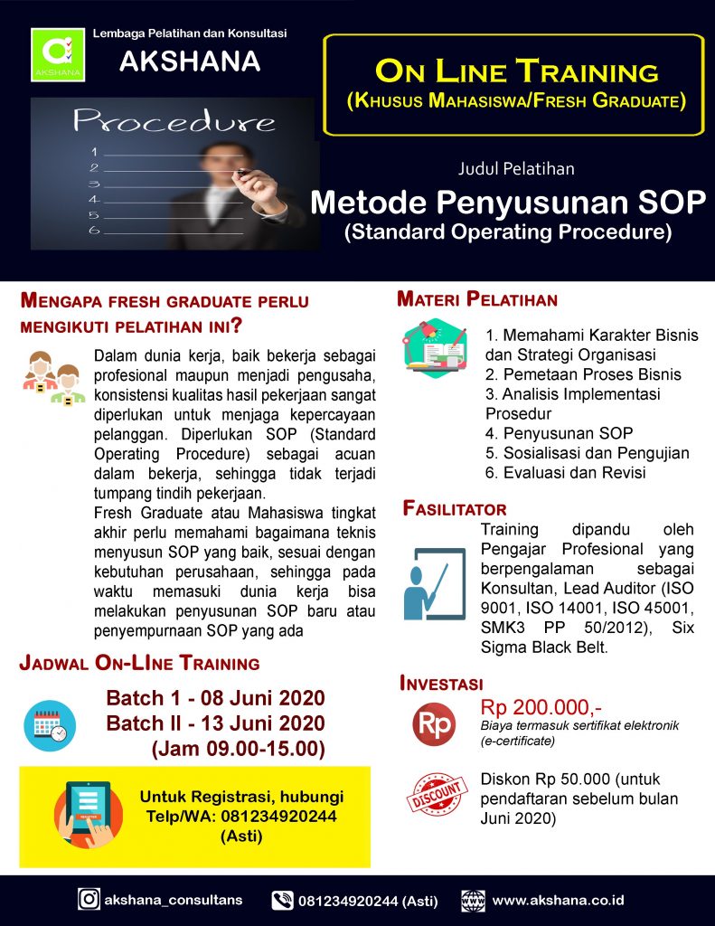pelatihan dan konsultasi Akshana menyelenggarakan pelatihan On-Line, dengan topik Metode Penyusunan SOP (Standard Operating Procedure). Kelas Pelatihan On Line dibuka khusus untuk mahasiswa tingkat akhir atau lulusan baru (freshgraduate), dalam rangka ikut serta meningkatkan kompetensi calon tenaga kerja baru.